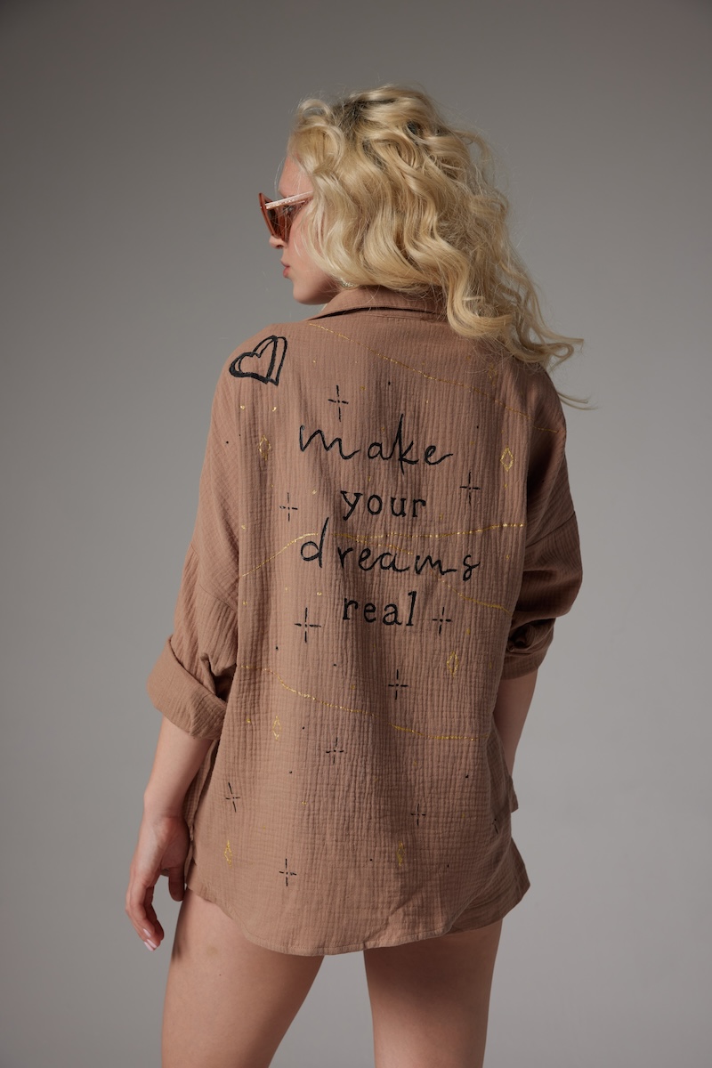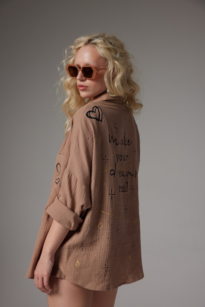 Bakmış olduğunuz ürün %100 müslin kumaşından üretilmiş olup, kişiye özel olarak doğal kumaş boyalarıyla boyanmaktadır. Her bir ürün giyilebilir sanat anlayışıyla kişiye özel olarak tasarlanmaktadır.