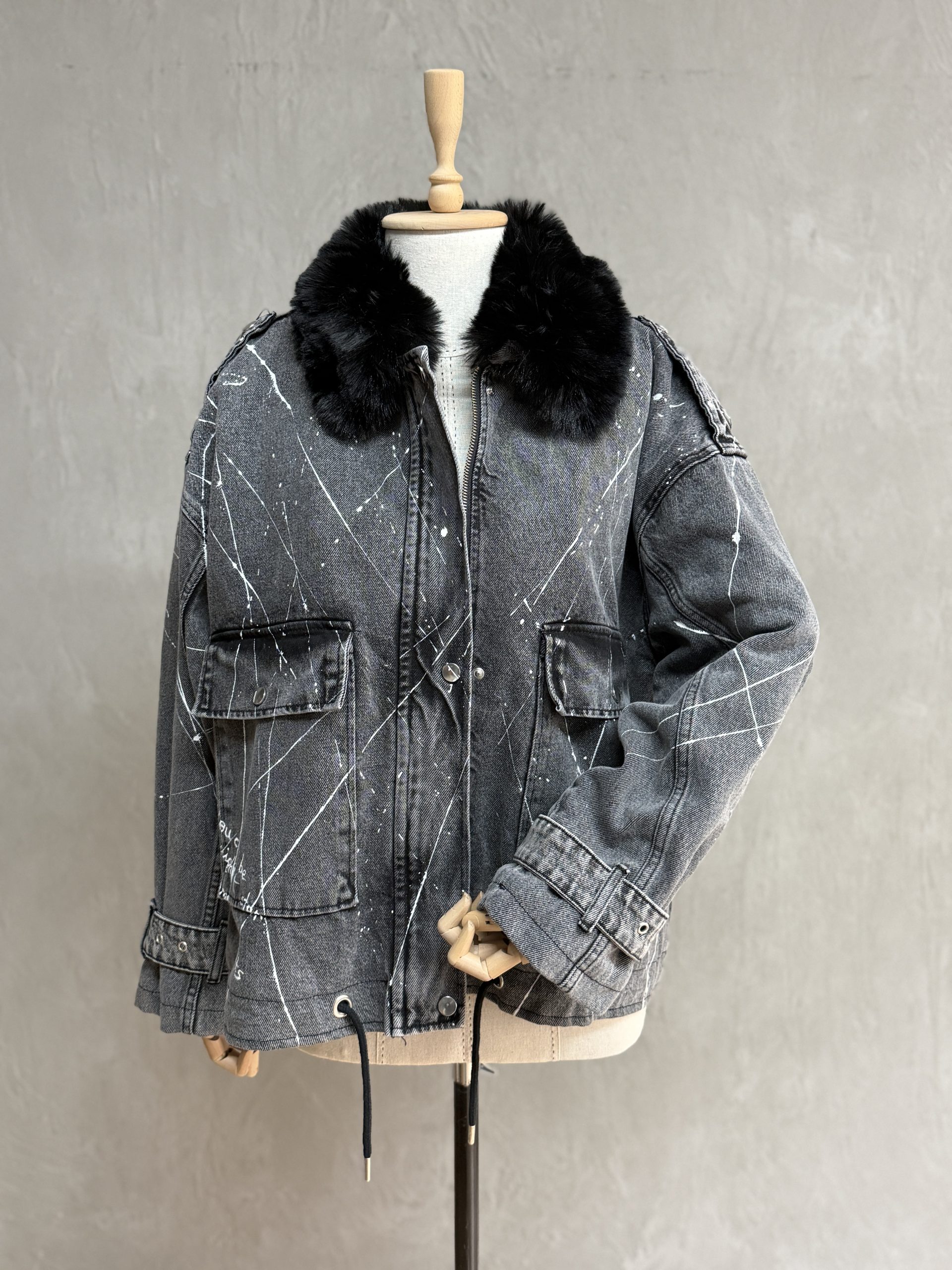 Kürklü Boyama Denim Ceket 02-Antrasit